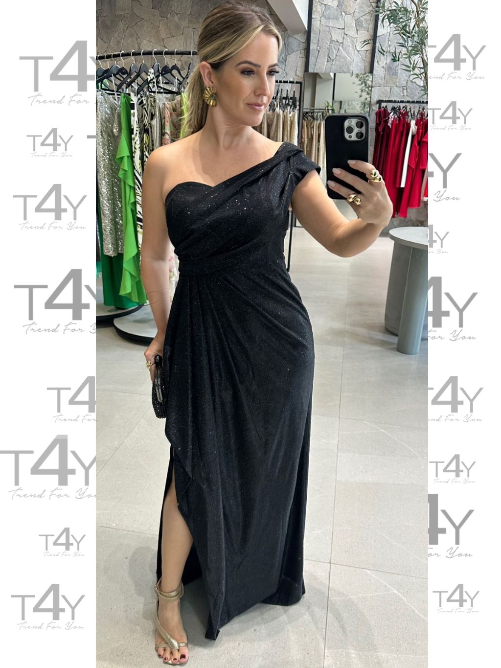 Vestido longo em tule, um ombro só com manga comprida; Abertura na lateral na cintura; fenda na lateral; com bojo; ziper na laretal;
