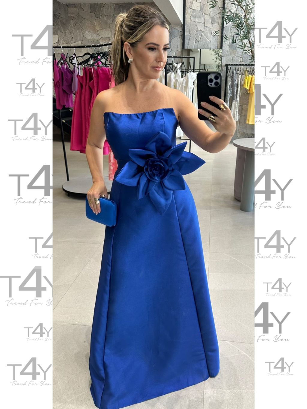 Vestido longo, tomara que caia, em tecido zibeline, com flor removível.