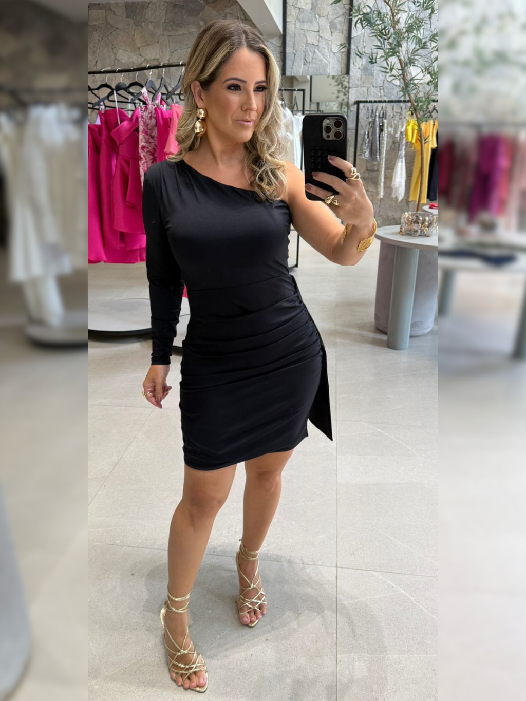 Vestido curto de um ombro só; Franzido na lateral; Manga longa;
