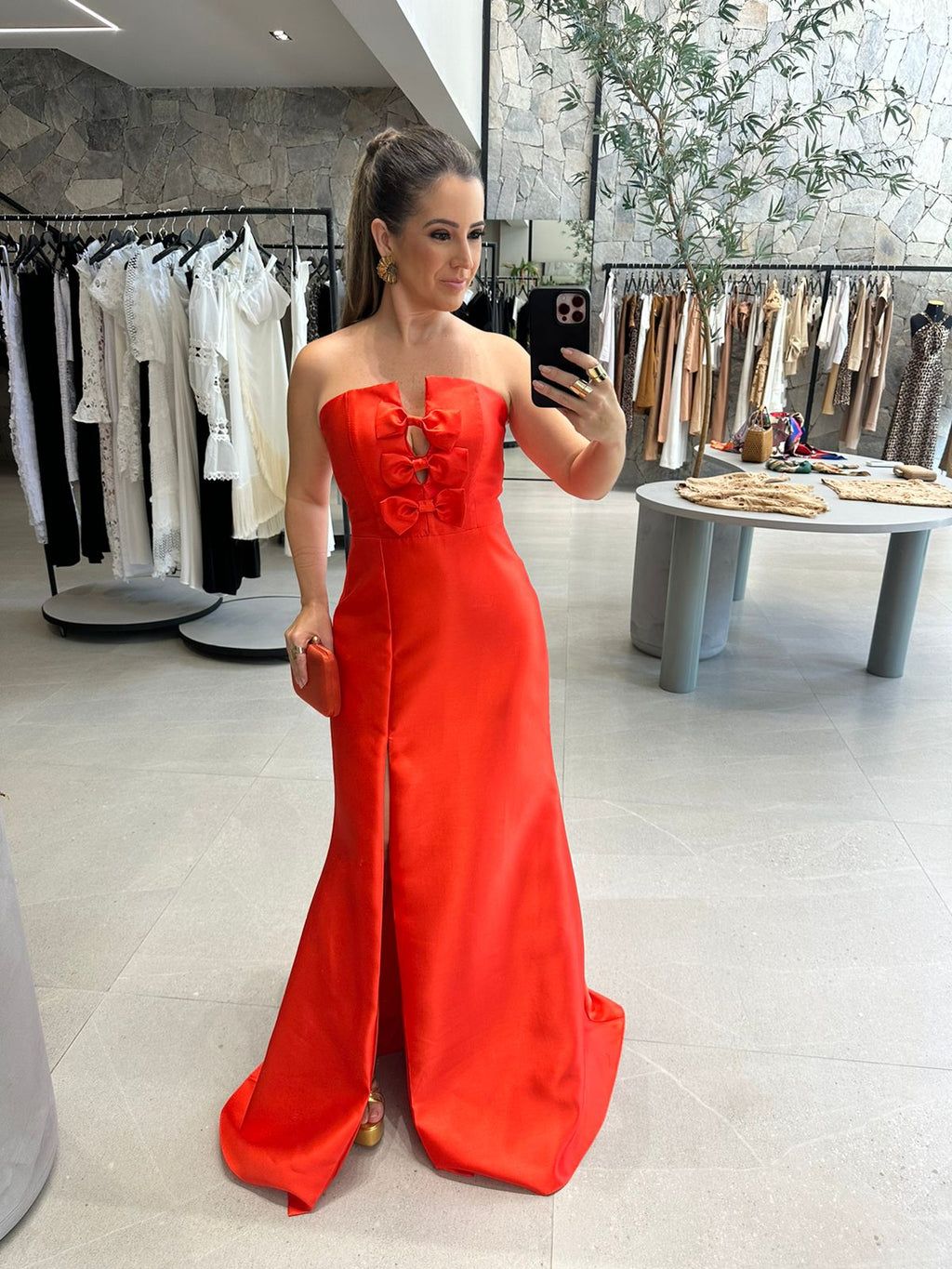 Vestido longo em zibeline tomara que cai, com laços no busto; com bojo; Fenda na lateral; zíper atrás;