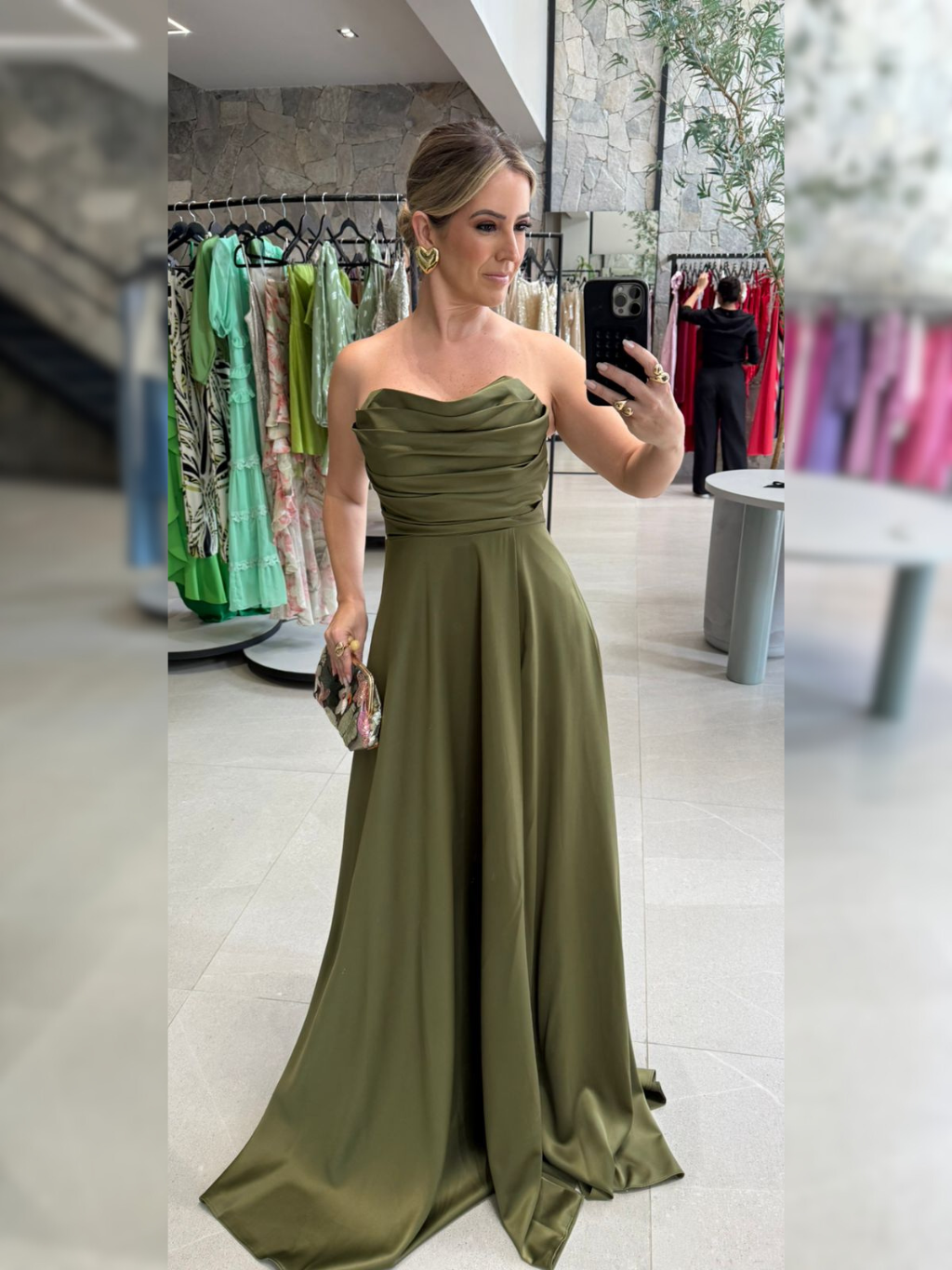Vestido longo crepe tomara que caia com detalhe drapeado no busto; Com bojo; Zíper nas costas; Fenda frontal
