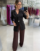 Blazer em alfaiataria com ombreiras e botão dourado;