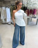 Blusa de um ombro só com manga longa, franzida na lateral, fenda na lateral;