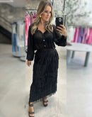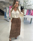 Blusa de botão, transparente, de manga longa e gola franzida.