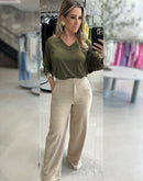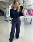 Blusa em malha, com decote V e mangas morcego 3/4.
