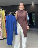 Blusa em poliamida, um ombro com manga longa, barra assimétrica, com fivela dourada;