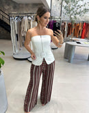 Calça pantalona estampada; com elástico atrás; Bolsos nas laterais;