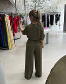 Conjunto em chiffon de blusa com manga curta, decote em V e elástico na cintura; calça pantalona, elastex atrás na cintura, bolso na lateral e botão;