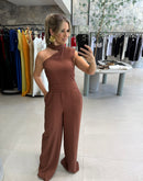 Tag: amarração pescoço, bolso, macacão, marrom, novidade, preto, roupas casuais, um ombro, viscose