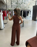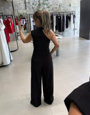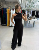 Macacão em viscose, um ombro só, com gola, ombreias, bolsos nas laterais, ziper na lateral;