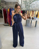 Macacão colar de corrente dourada e prata, zíper na lateral; contém bolsos, acompanha faixa;