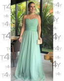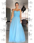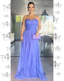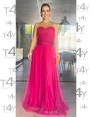 Vestido longo tomara que caia, com faixas em tule para estilização.