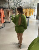 Vestido curto em malha, manga longa, blusado, franzido na cintura, decote em V atrás com amarração;