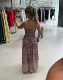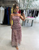 Vestido midi, tomara que caia, franzido nas laterais, estilo sereia, acompanha faixa na mesma estampa, ziper atrás;