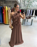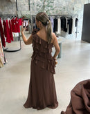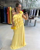 Vestido longo em chiffon, um ombro, com babados, broche de rosa, forrado; com bojo, ziper na lateral;
