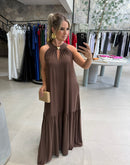 Vestido longo em poliamida, solto, com amarração no pescoço; Bolsos nas laterais; Fivela dourada na frente;
