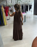 Tag: amarração pescoço, fivela, marrom, novidade, roupas casuais, vestido, vestido longo