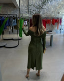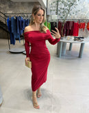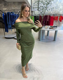 Vestido midi ombro a ombro em malha jersey, manga 3/4; com bojo; zíper atrás;