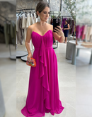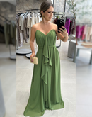 Vestido em chiffon, tomara que caia, com babados; decote em V; contém bojo; ziper atrás; contém forro; acompanha cinto; Tecido externo: 100% Poliéster Tecido interno: 100% Poliéster