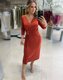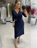 Vestido longuete em malha, com decote transpassado em V; Mangas 3/4; Detalhe lindo de fivela assimétrica dourada; Fenda na lateral;