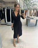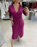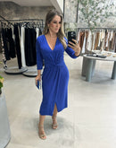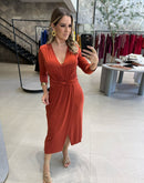 Vestido midi de malha com decote em V, manga 3/4 e detalhe de cinto na frente em nó;  Com bojo;  Fenda na lateral. Tecido externo: 96% Poliéster  4% Elastano Tecido...