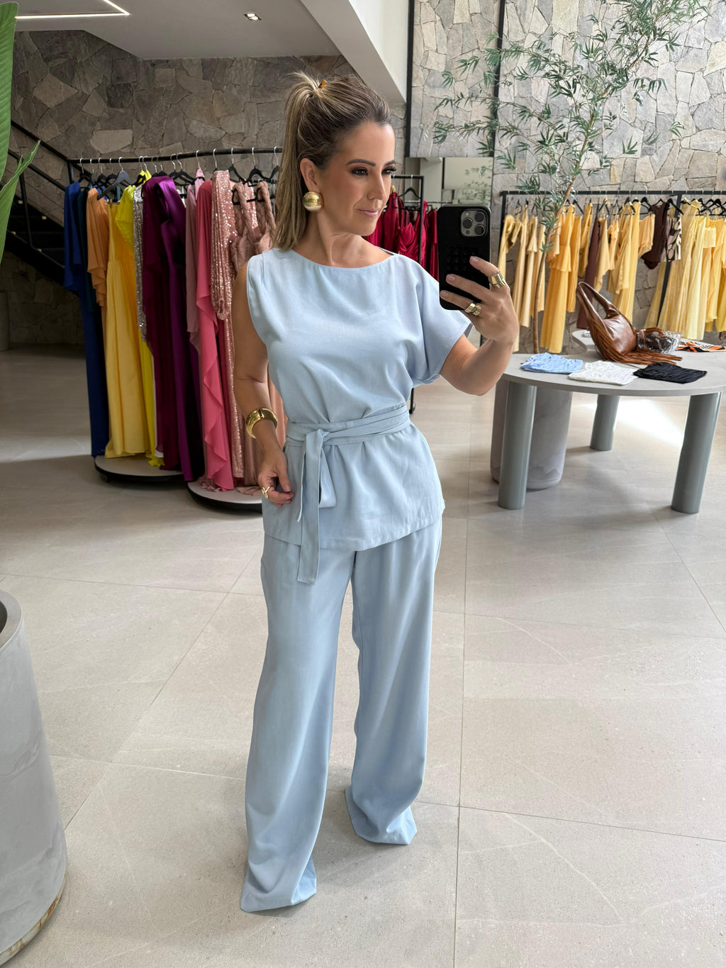 Calça em linho pantalona, com bolsos na lateral, botão e ziper na frente;