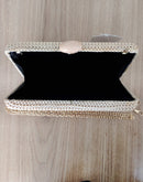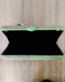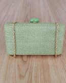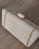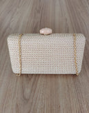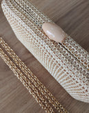Clutch em palha com alça dourada, fecho na cor bege; Espaço ideal para colocar celular, documentos e maquiagem.
