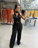 Tag: cinto, decote V, gola halter, halter, macacão, preto, roupas casuais, ziper