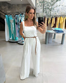 Macacão regata, com bolsos na lateral; ziper atrás; acompanha cinto marrom;