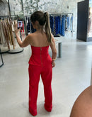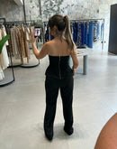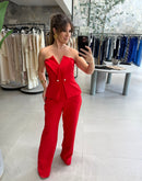 Macacão em alfaiataria, tomara que caia, botão de enfeite; ziper atrás; com bolsos na lateral;