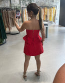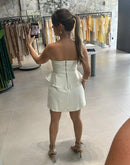 Macaquinho tomara que caia, com short saia, ziper atrás;