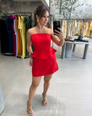 Macaquinho tomara que caia, com short saia, ziper atrás; Tecido externo: 95% poliéster 5% Elastano Tecido interno: 100% Poliéster