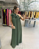 Vestido longo em chiffon, com babados plissado, um ombro, ziper na lateral.
