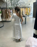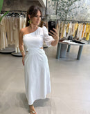 Vestido midi um ombro, com manga 3/4. Aberturas na cintura, ziper na lateral; Bolsos nas laterais; Contém forro;