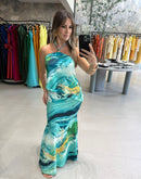 Conjunto estampado, em malha, blusa assimétrica, saia longa com elástico na cintura;