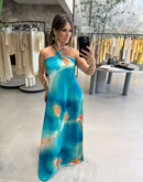 Vestido longo, estampado, em malha, frente única; metal no pescoço;