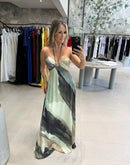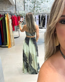 Vestido longo estampado, com amarração no pescoço, abertura no busto, forrado;