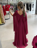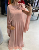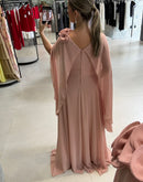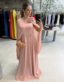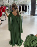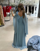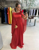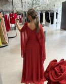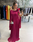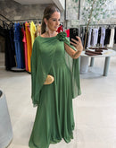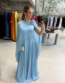 Vestido longo, com capa, broche de flor, ziper atrás; com bojo; fenda na frente; forrado;