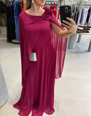 Vestido longo, com capa, broche de flor, ziper atrás; com bojo; fenda na frente; forrado; Tecido externo: 100% Poliéster Tecido interno: 100% Poliéster