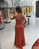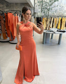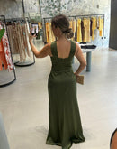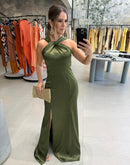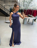 Vestido longo em crepe, com alças transpassada; Com bojo; Zíper atrás; Fenda na frente;
