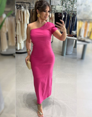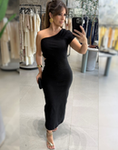 Vestido midi, um ombro só, aberto na cintura, com fivela dourada, ziper atrás; fenda atrás;