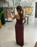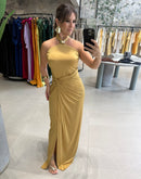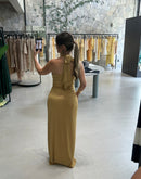 Vestido longo em malha jersey; com amarração no pescoço, fivela dourada, detalhe de nó na cinruta;