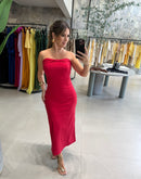 Vestido midi tomara que caia em viscose, liso, ziper atrás, fenda atrás;