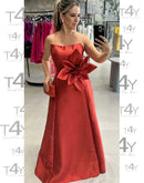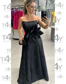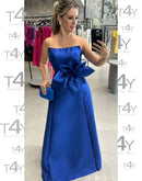 Vestido longo, tomara que caia, em tecido zibeline, com flor removível.