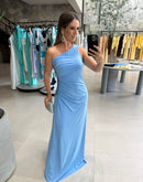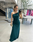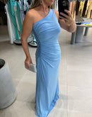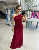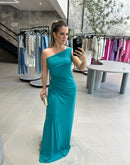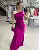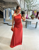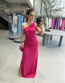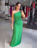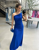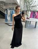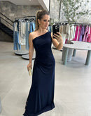Vestido longo de malha, de um ombro só e paetê na lateral.