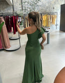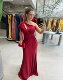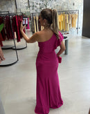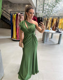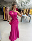 Vestido longo em malha jersey, de um ombro só, abertura no busto, com bojo; fenda na frente; ziper na laretal; Tecido externo: 90% Poliéster 10% Elastano Tecido interno: 100% Poliéster