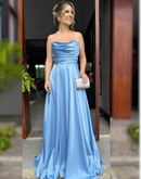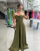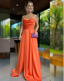 Vestido longo crepe tomara que caia com detalhe drapeado no busto; Com bojo; Zíper nas costas; Fenda frontal