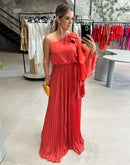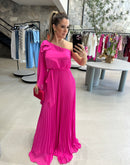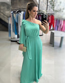 Vestido longo em chiffon, de um ombro só com manga, e detalhe de laço no ombro.