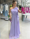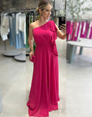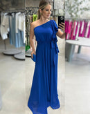 Vestido longo de um ombro só, com manga curta de babado e um laço no ombro.