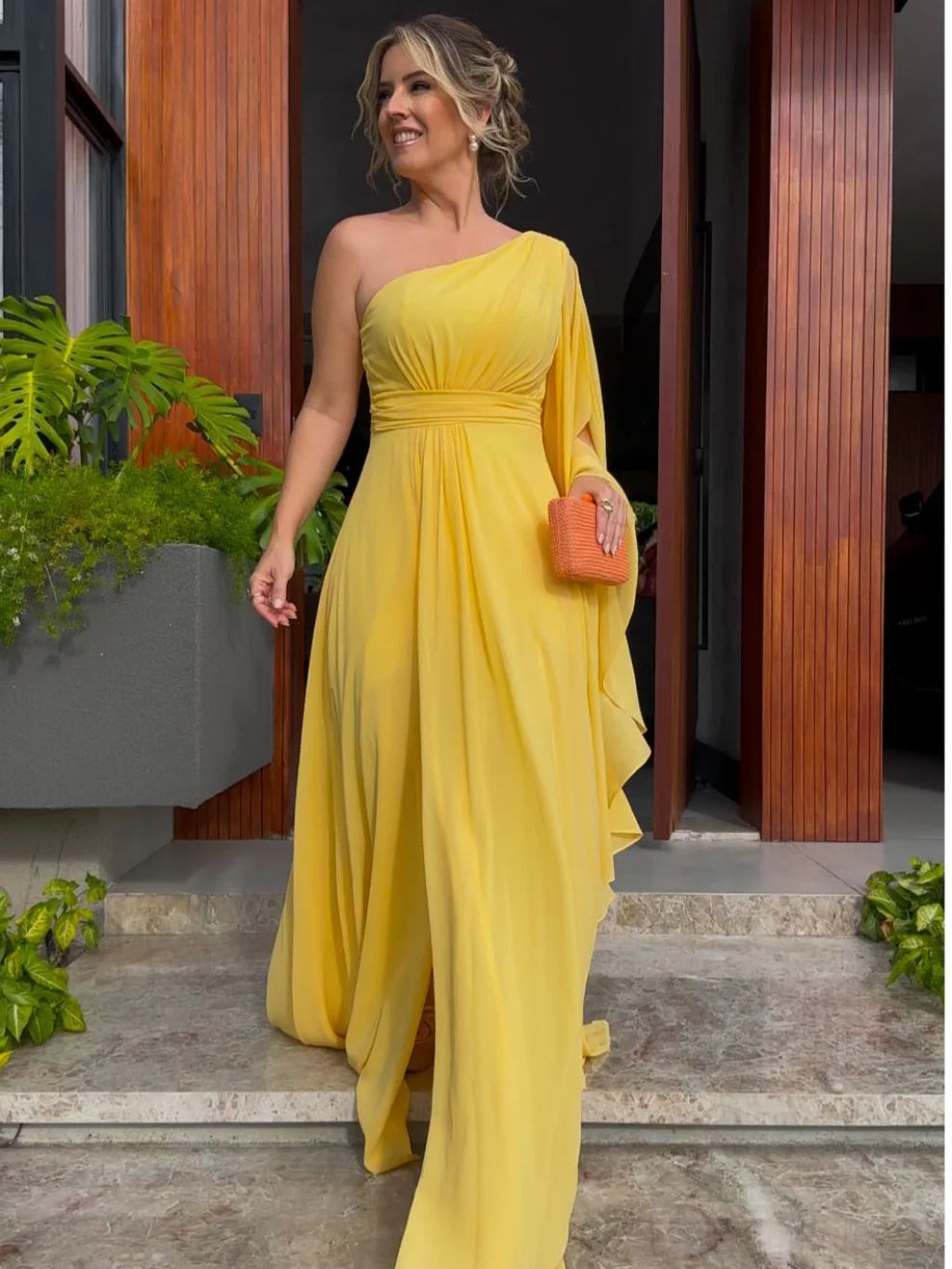 Vestido longo leve, em chiffon, de um ombro só com manga estilo capa.